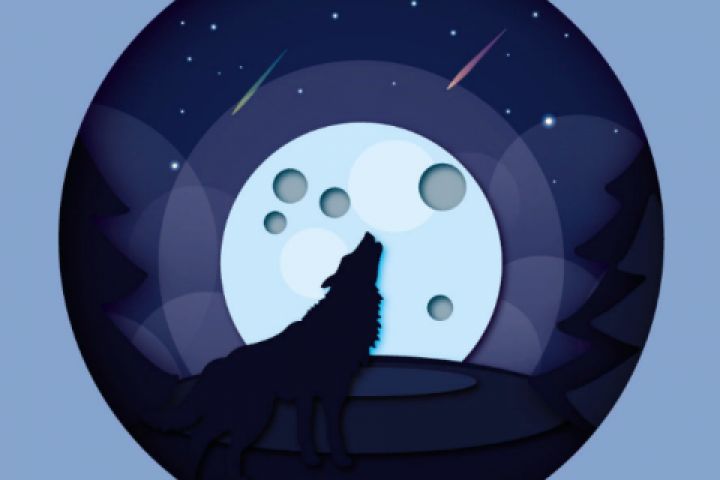 иллюстрация: волк в лесу, волк воет на луну. эффект бумажной вырезки.