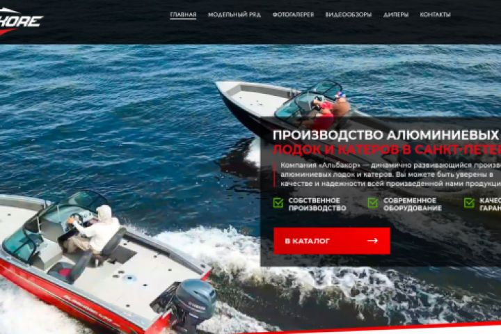 презентационный сайт питерской компании-производителя алюминиевых катеров и лодок. Дизайн сайта можно назвать свежим, морским и летним. Яркие тона синего и красного цветов передают динамику и атмосферу водных развлечений. Сразу же в шапке расположена ссылка на каталог и перечень ключевых особенностей компании. Каталог, по сути, является стандартной магазинной витриной движка, но без возможности приобретения катера онлайн по понятным причинам. Все заказы принимаются через форму заявки. Качество текстовой составляющей находится на крепком уровне: читабельные шрифты, нормальное форматирование материалов.