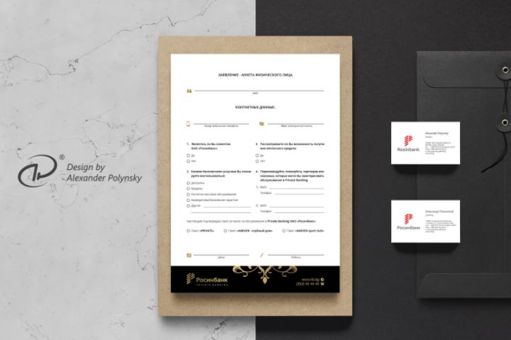 Бланк-заявление (210x297(h)mm) и визитки (90x50(h)mm).