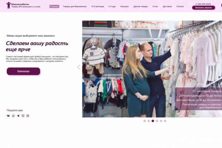 Дизайн главной страницы детского магазина с частью каталога, предложениями и другими полезными материалами. Также есть адаптивный дизайн под планшет и телефон.