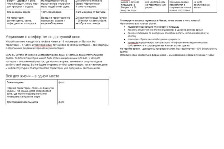 Разработала структуру и текст для рекламного лендинга агентства недвижимости. Цель лендинга – продажа таунхаусов в Грузии. Выделила преимущества конкретного объекта, которые важны для целевой аудитории (местоположение, экология, транспортная доступность и наличие инфраструктуры, инвестиционная привлекательность). Добавила призыв к действию, сделав акцент на «боли» целевой аудитории (нежелание заниматься покупкой самостоятельно).