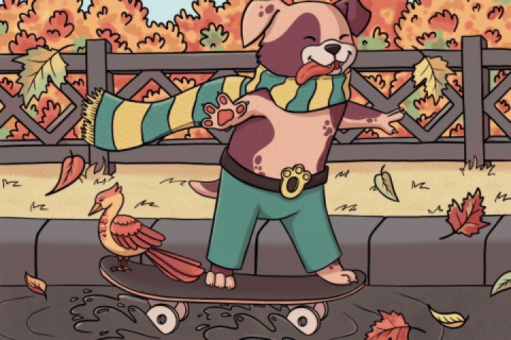 Детская иллюстрация. Щенок едет на скейте по осенней улице.