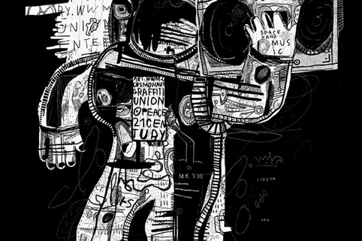 Космонавт, космос, меломан, граффити, монохромный, надпись, скафандр, музыка, магнитофон, ретро, принт,