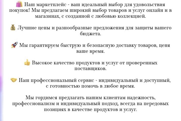 Хотите, чтобы ваш бизнес процветал? Нужен качественный продающий текст? Перевод документации? Или, может, вам нужен сценарий для рекламного ролика? Тогда вы обратились по адресу! Я – опытный специалист, который поможет вам достичь успеха. Мои услуги включают написание продающих текстов, переводы любой сложности и создание сценариев. Работаю быстро и качественно. Доверьтесь мне, и ваш бизнес выйдет на новый уровень!