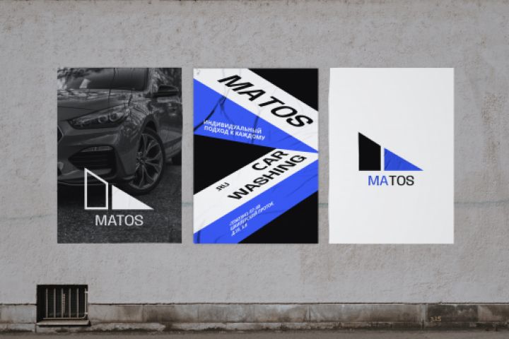 Пояснение: сам логотип показывает движение, ускорение (с помощью вытянутого треугольника). Черная трапеция символизирует грязь и имеет неподвижную форму. Синий треугольник показывает итог того, каким становится автомобиль после услуг Matos - чистым, быстрым, мощным. Огромную роль для этого играет цвет, форма и направление.