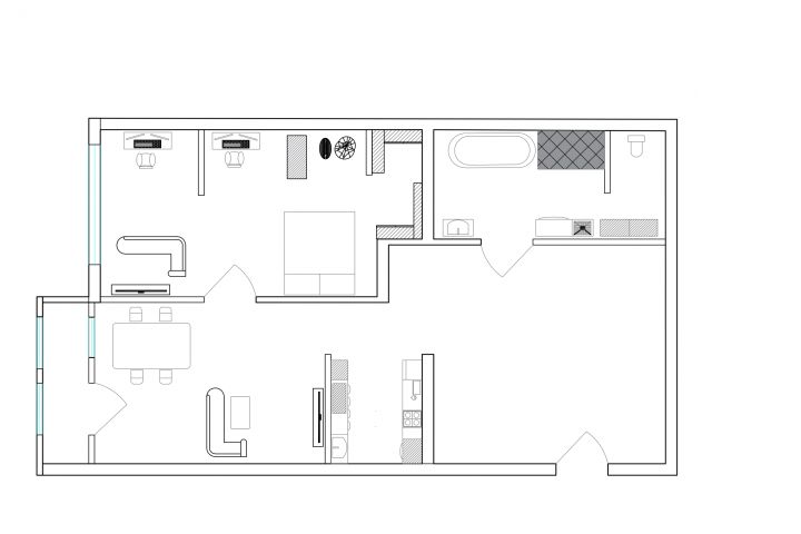Расположение на чертеже-схеме фурнитуры, мебели и отрисовка еë частей.