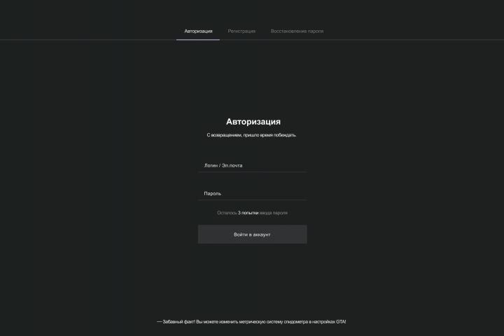 Дизайн и верстка копии интерфейса регистрации, авторизации игрового проекта Arizona V на платформе RageMP