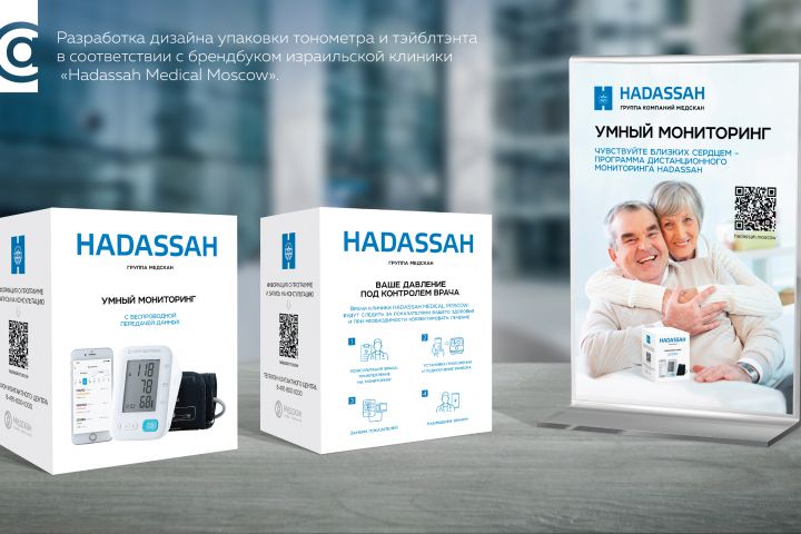 Разработка дизайна упаковки тонометра и тэйблтэнта, в соответствии с брендбуком израильской клиники «Hadassah Medical Moscow».