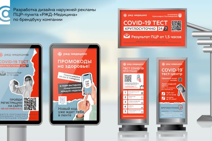 Разработка дизайна наружней рекламы ПЦР-пункта «РЖД-Медицина» по брендбуку компании