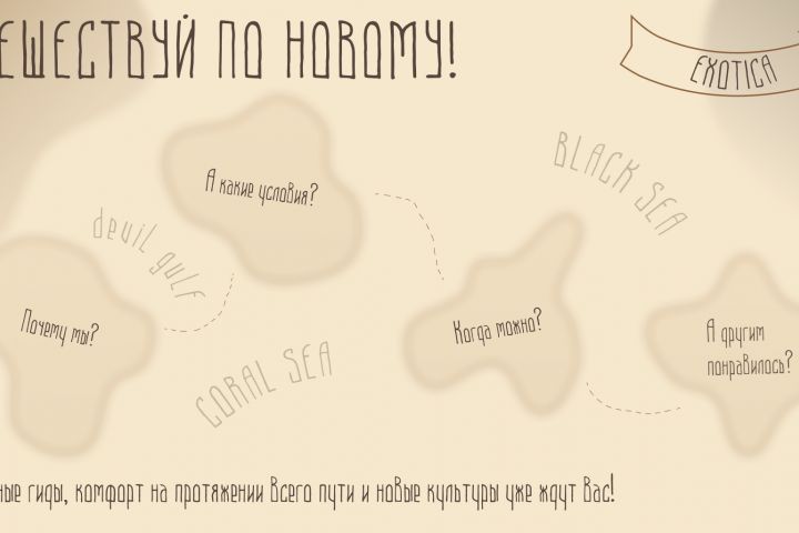 Экзотика и безопасность рука об руку - вот девиз этого проекта! Я постралась создать действительно необычный туристический сайт с уникальными иллюстрациями и необычной метафорой - картой, ведущей пользователя от приветствия до целевого действия.