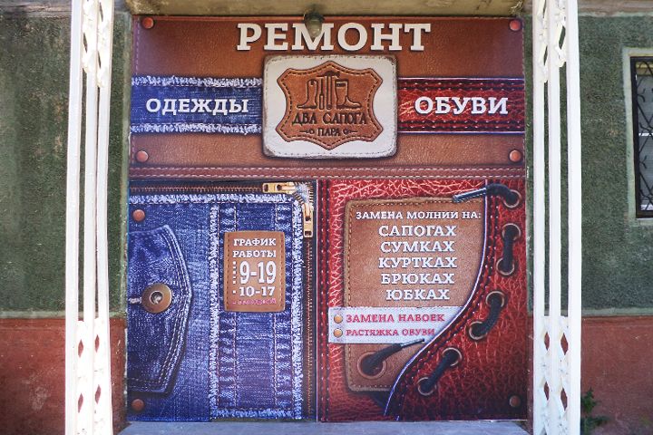 Разработал броский и детализированный дизайн баннера на фасад мастерской по ремонту одежды и обуви "Два сапога пара".