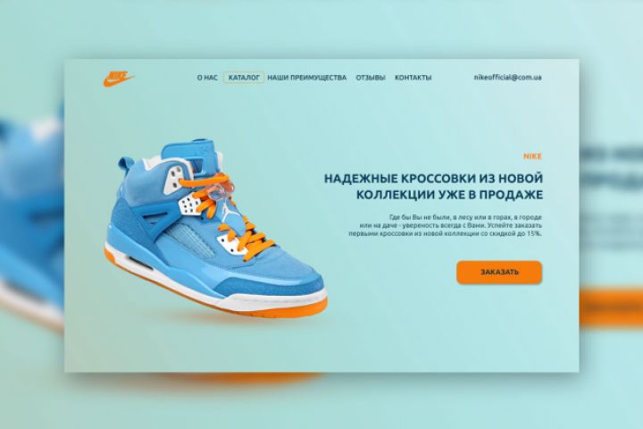 Разработка посадочной страницы фирмы "Nike". Акцент на новую яркую модель кроссовок со скидкой.