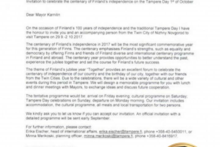 Письмо адресовано мэру Нижнего Новгорода Карнилину И.Н. от отдела по международным отношениям города Тампере (Финляндия). Тема - приглашение на празднование столетия независимости Финляндии. Перевод данного письма был выполнен в течение 2 часов.