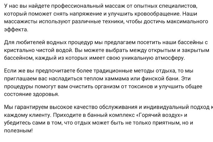 Подробный продающий текст, способный заинтересовать внимание многих потенциальных посетителей чудесного банного комплекса "Горячий воздух")
