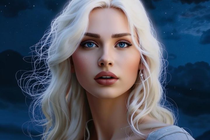 Девушка с голубыми глазами белые волосы на фоне луны