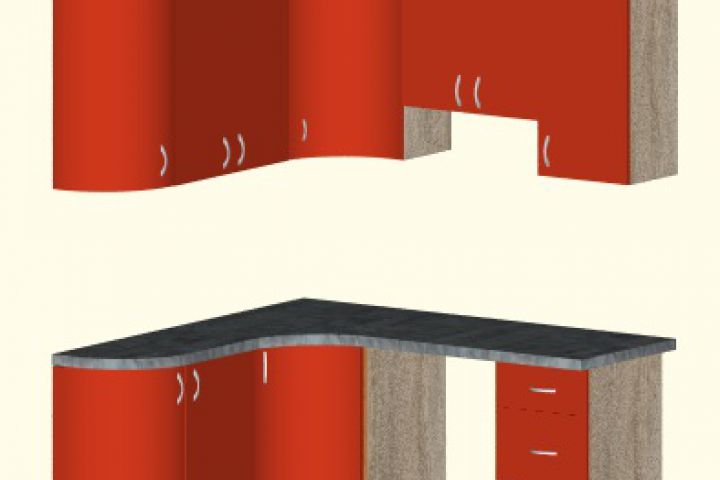 Кухня угловая с радиусными фасадами, пеналом и карнизом