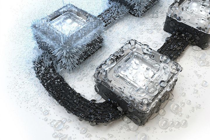 Затем провел симуляцию жидкости и накапал дождиком с одной стороны картинки. А с другой при помощи инструмента "мех и волосы" нарастил кристаллы льда.