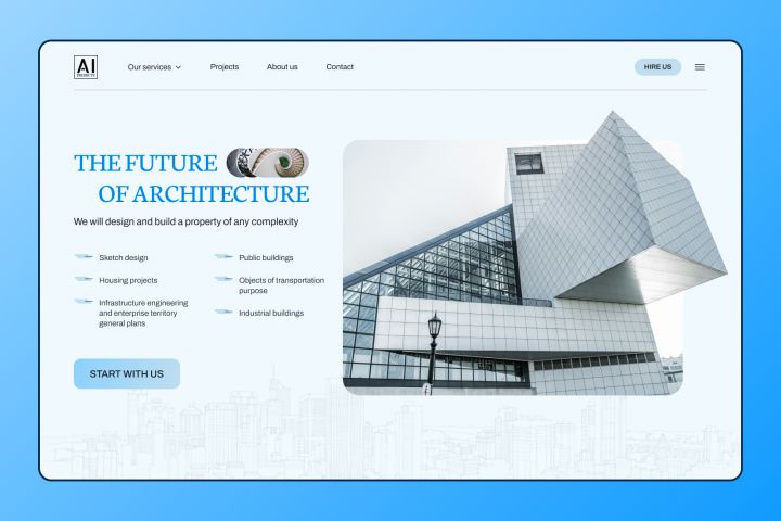 Цель создания - учебная. Необходимо было разработать варианты дизайн концептов первого экрана для архитектурной компании.