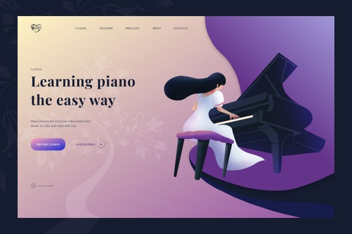 Цель создания - учебная. Необходимо было разработать дизайн концепт первого экрана для музыкальной школы.