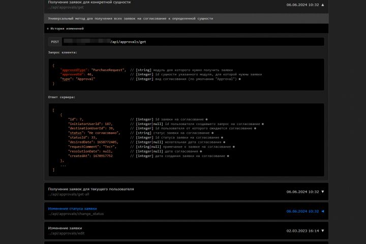 Создание бэкенд API сервиса на фреймворке Laravel для корпортивной CRM с фронтендом на React, а также оформление удобной интерактивной документации с функциями навигации, автоскроллинга и многоуровневых раскрываемых табов с информацией.