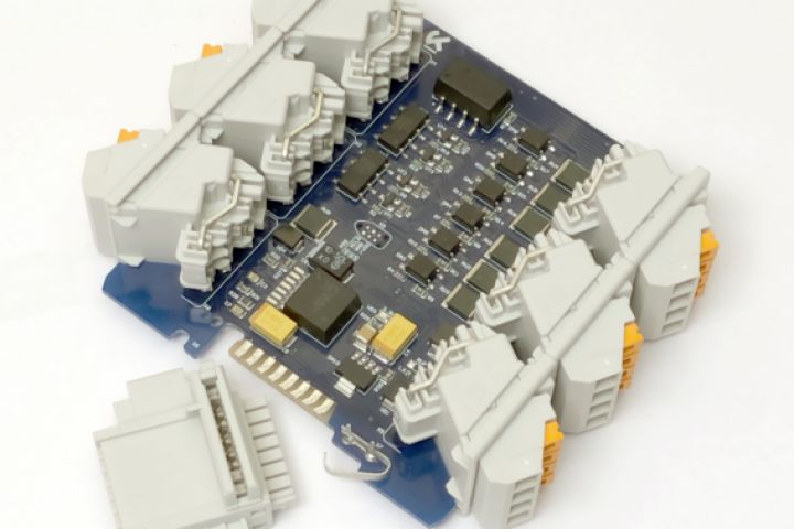 Печатный узел 4 класса точности (2 слоя) для реле, функционирующего под управлением внешнего контроллера по протоколу Modbus, конфигурируемого и программируемого по интерфейсу RS 485. Имеет 4 выхода и 6 входов релейного типа. Устанавливается на DIN-рейку. Обеспечивается наращивание контролируемых входов и выходов путем соединения нескольких реле по шинному соединителю.