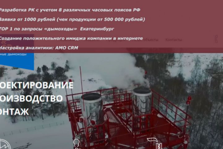 Разработка РК с учетом 8 различных часовых поясов РФ Заявка от 1000 рублей (чек продукции от 500 000 рублей) ТОР 1 по запросы «дымоходы» Екатеринбург Создание положительного имиджа компании в интернете Настройка аналитики: AMO CRM