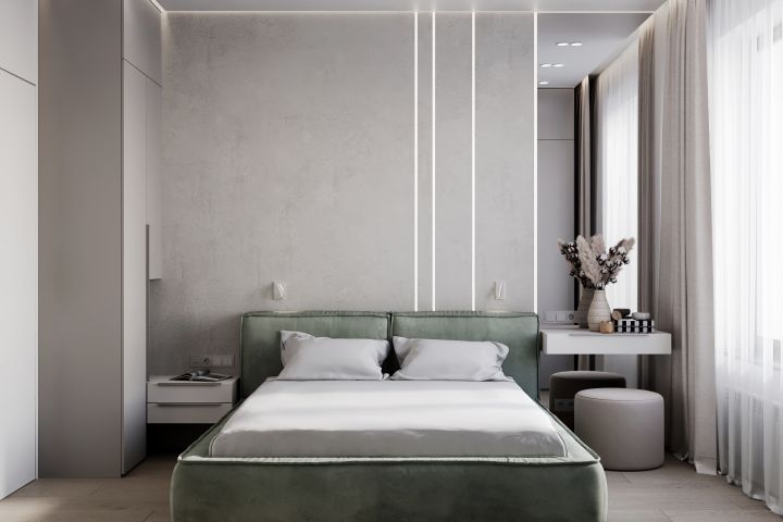 Спальня в современном стиле в теплых оттенках бежевого и оливкового. В качестве декора стен использована фактурная штукатурка, световые полосы и огромное зеркало. Главной доминантой комнаты служит большая стильная кровать в интересном цвете.