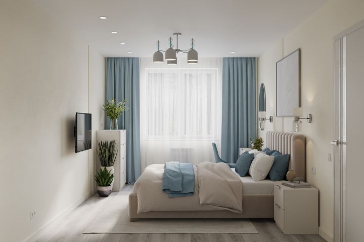 Квартира располагается в Зеленогорске и предназначена для летнего проживания и отдыха. Сочетание бежевого и голубого дает отсылку к песку и морю, дарит чувство умиротворения, настраивает на режим восполнения энергии.