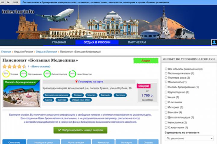 Система поиска и бесплатного бронирования номеров в отелях, гостиницах, гостевых домах, пансионатах, санаториях и прочих объектов размещения.