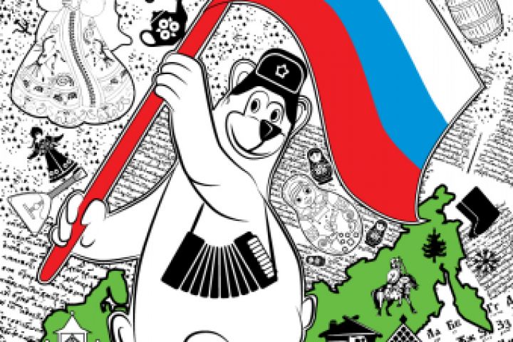 Россия без истории? Невозможна. Конечно это наши предки славяне. Их письменность. Главным персонажем решила сделать медведя. Не с балалайкой по традиции, а с гармонью, которая не задействована, а лишь находится "при нЁм"). В лапах мишка держит флаг. Возможно в африке царь зверей лев, а у нас медведь! Именно поэтому он главный, ну и конечно же в ушанке!
