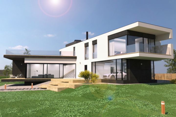 На участке располагается двухэтажный жилой дом, баня и гостевой домик, соединенные сетью дорожек. Форма основного здания образована врезкой двух прямоугольных объемов - одноэтажного и двухэтажного. Они пересекаются под углом 110 градусов, раскрываясь в южную сторону и обеспечивая лучший вид в сторону понижения рельефа. Отделка объемов подчеркивает сепарацию элементов. Один прямоугольник облицован под черный матовый металл, второй под белую фактурную штукатурку. Дом расположен на рельефе, который подчеркивает консольное нависание плиты первого этажа. Это создает эффект парения и легкости. Из гостиной можно попасть на террасу благодаря раздвижным витражам. Они оснащены встроенной системой солнцезащиты. На втором этаже размещаются кабинет, детские и мастер-спальня с выходом на балкон. Спальня нависает над стеклянным гаражом. На кровле предусмотрены фонари верхнего света для дополнительного освещения. Солнечные батареи, установленные на кровле, повышают автономность и энергоэффективность здания.