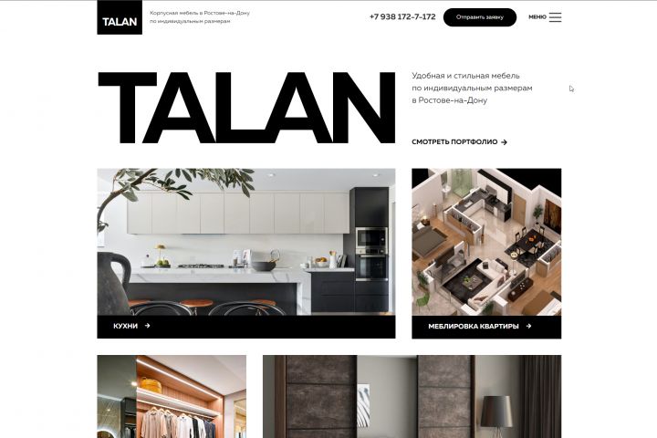 Многостраничный сайт для мебельной компании TALAN, которая занимается производством и установкой мебели по индивидуальным размерам.