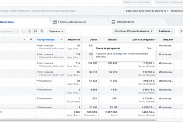 Результаты моей работы : получено более 1000 лидов, средняя цена за лид за весь период