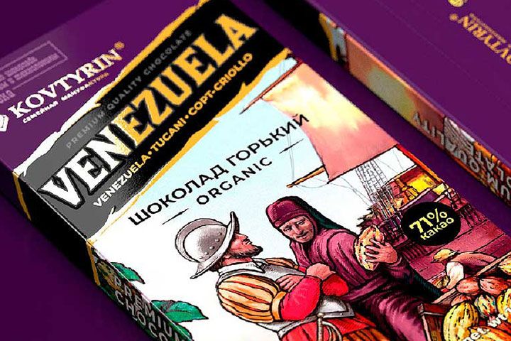 Дизайн упаковки органического темного шоколада из какао-бобов производства Венесуэлы.