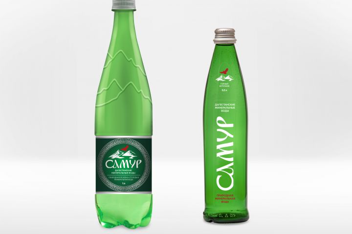 В рамках этого проекта была разработана форма бутылки на 1 литр с ребрами жесткости (горы), логотип "Самур" и две этикетки - на 1 литр (ПЭТ бутылка) и на 0,5 литра (стекло).