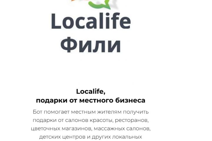 Localife, подарки от местного бизнеса. Бот помогает местным жителям получить подарки от салонов красоты, ресторанов, цветочных магазинов, массажных салонов, детских центров и других локальных предпринимателей. Простое решение, чтобы быть на связи с клиентами.