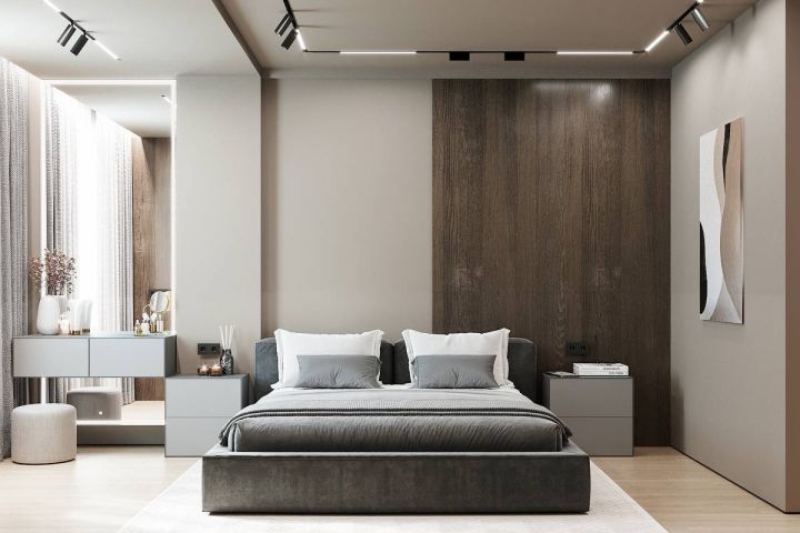 Дизайн-проект спальни для молодой пары с гардеробной и личным санузлом. Выполнен в сдеражнном, минималистичном, современном стиле, с использованием светло серых тонов и темного дерева. Имеется будуарный столик, рабочий зона, ТВ-зона.