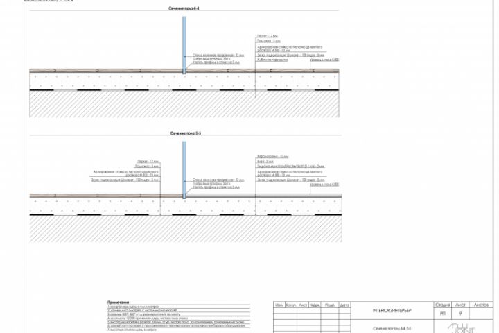 Сечение пола 4-4: стык паркета с перегородкой из коленного стекла.