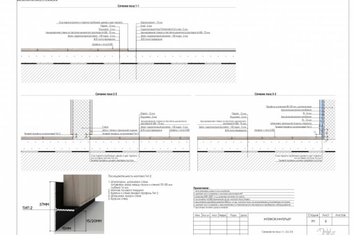 Сечение пола 3-3: стык паркета со стеной (шумоизоляционная мембрана и отделка покраска) с использованием теневого профиля.