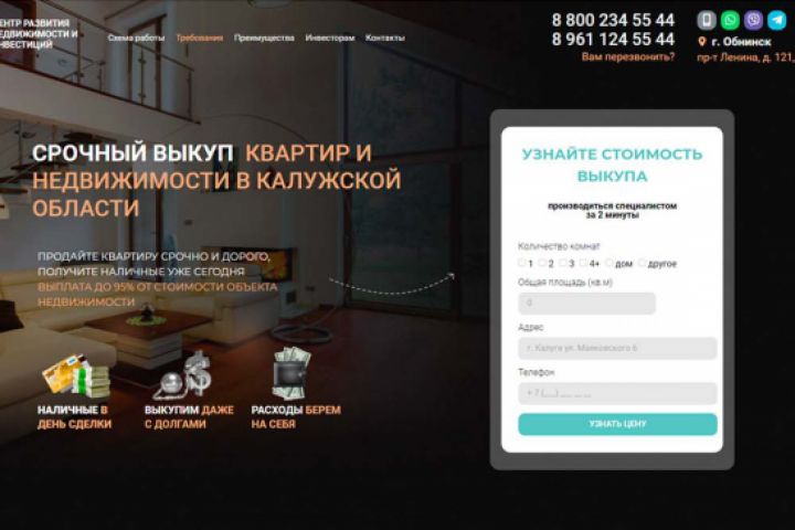Лендинг по выкупу недвижимости в Обнинске и Калужской области. В Топ 3 Яндекса. Посмотреть сайт можно по ссылке ниже