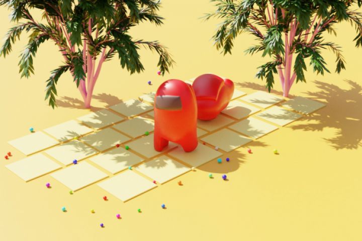 Сцена и персонаж из игры Among US. Работа выполнена в Blender Был создан скелет персонажа для создания движений