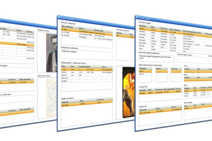- обширный функционал работы с фотографиями: позиционирование человека на фото, привязка фотографий к событиям и пр.;
