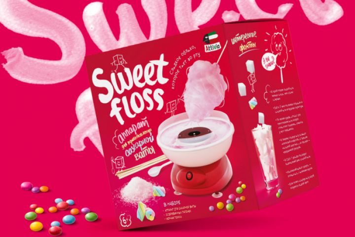 Упаковка для аппарата для приготовления сахарной ваты. Разработка уникальной надписи названия, графических элементов, дизайн, подбор шрифта.