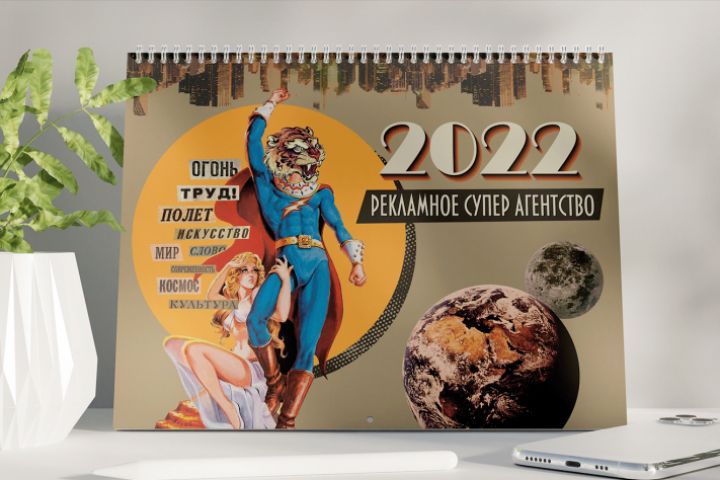 Авангардный коллаж в стиле дадаизм, небанальным образом демонстрирует символа года – голубого тигра. Тигр супергерой отражает слоган компании «рекламное супер агентство». Позитивные слова из советских газет служат напутствием на будущий год.
