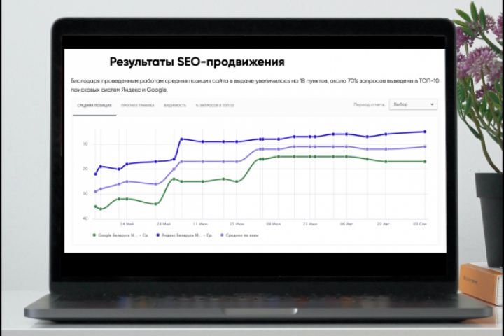Результаты SEO-продвижения Благодаря проведенным работам средняя позиция сайта в выдаче увеличилась на 18 пунктов, около 70% запросов выведены в ТОП-10 поисковых систем Яндекс и Google.