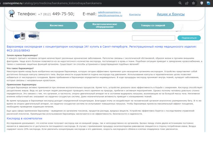 Профессиональное косметологическое оборудование. Кислородная барокамера. Рерайт текстов+SEO, подбор технических характеристик, подготовка фотографий, внесение данных на сайт, создание и описание разделов.