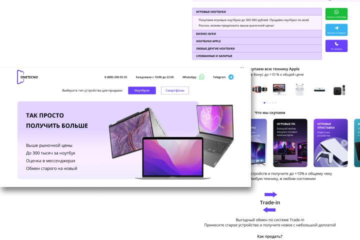 Дизайн для сайта 1tecno.ru по скупке б/у устройств. Переключение светлой и темной темы сайта (светлая - ноутбуки, темная - смартфоны). Информация о возможностях, преимуществах, процессе и возможность связаться или оставить заявку на оценку устройства.