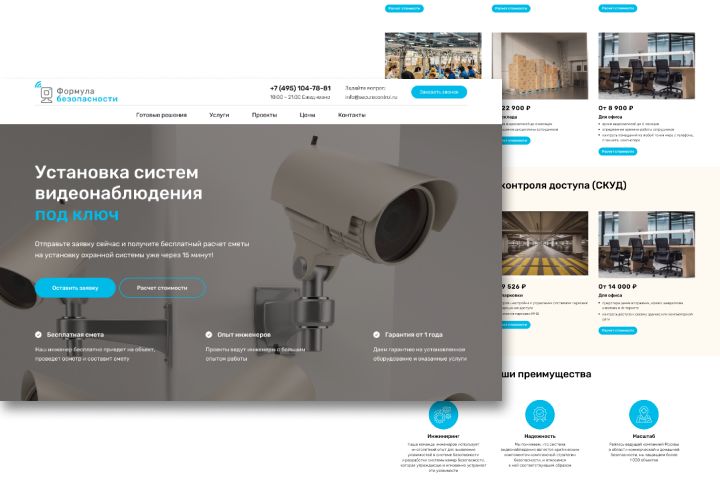 Landing Page для компании "Формула безопасности", занимающейся установкой систем видеонаблюдения и систем контроля доступа. Предусмотрены инфографика, формы заказа звонка, квиз-опрос для потенциального клиента.