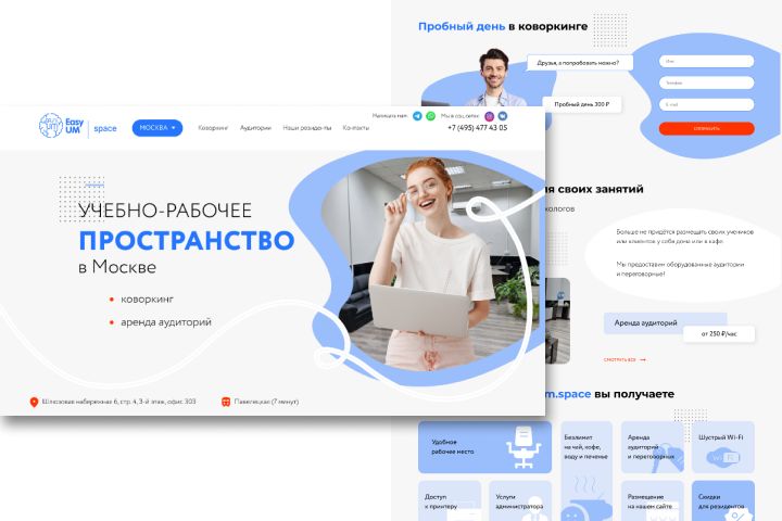 Дизайн для главной страницы учебно-рабочего пространства "Easy Um | space". Информация о коворкинге и компании, форма обратной связи.