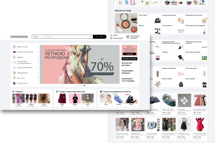 Дизайн для платформы оптовых продаж. Товары по категориям, строка поиска товаров на главной странице. Кнопка регистрации и входа в аккаунт. Кнопка регистрации продавца. Предусмотрен чат с продавцом. Страницы профилей покупателя и продавца. Возможность смотреть заказы, настраивать пароль и 2FA. Возможность продавцу добавлять товары.